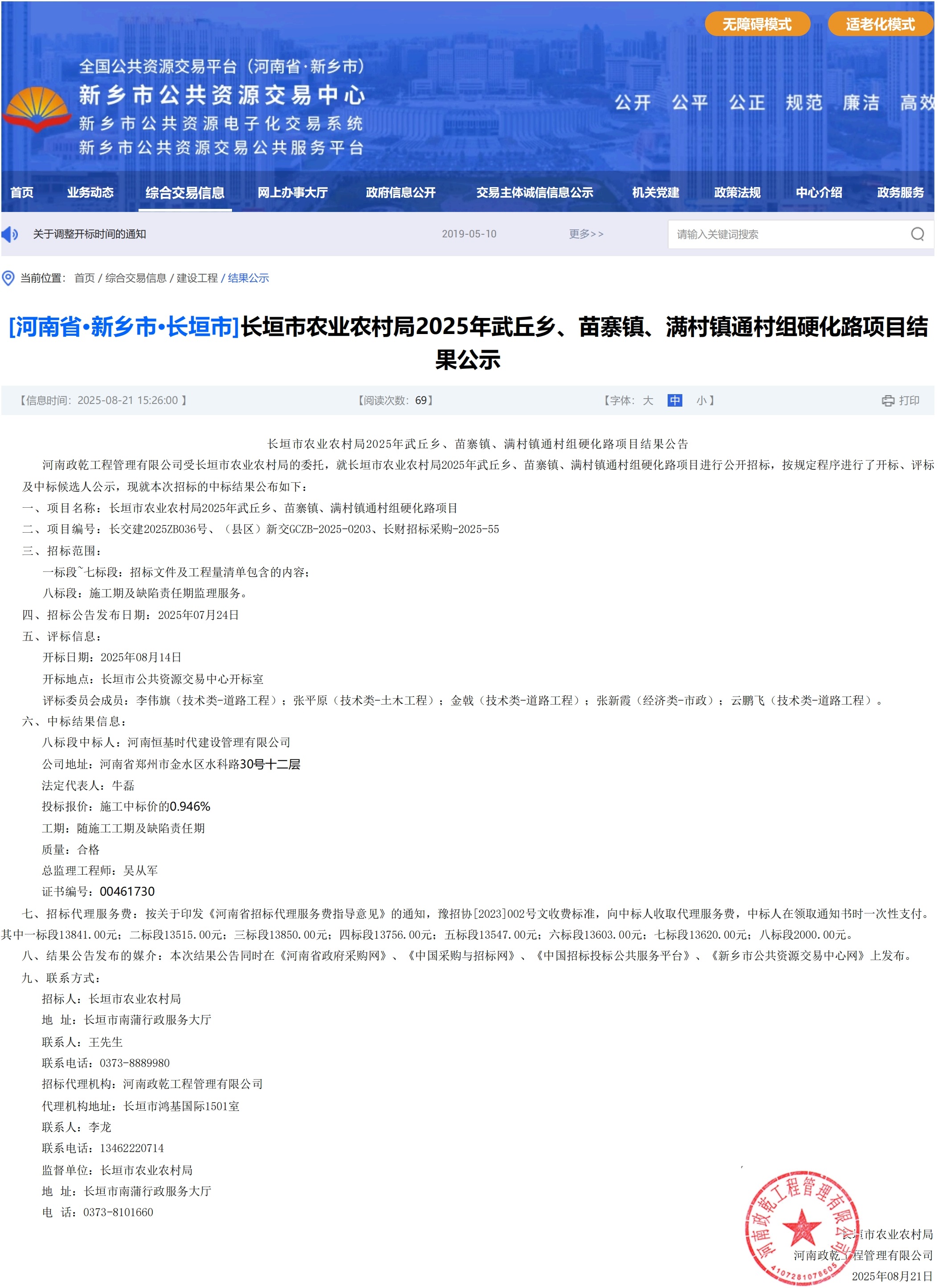 長垣市農(nóng)業(yè)農(nóng)村局2025年武丘鄉(xiāng)、苗寨鎮(zhèn)、滿村鎮(zhèn)通村組硬化路項目-結(jié)果公告