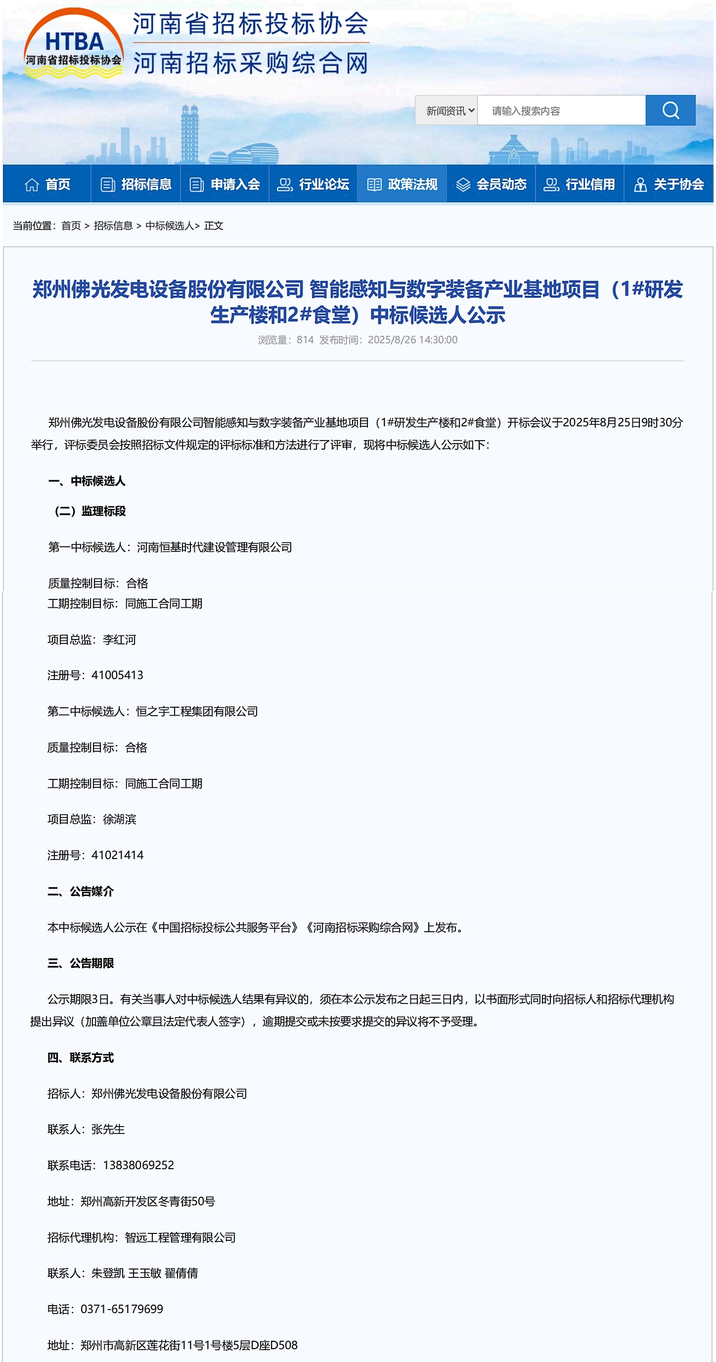 鄭州佛光發(fā)電設備股份有限公司 智能感知與數(shù)字裝備產業(yè)基地項目(1#研發(fā)生產樓和2#食堂)-中標公告